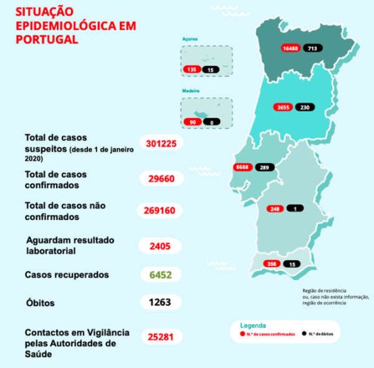 Desde o início da pandemia, Portugal registou 1.263 mortes associadas à COVID-19 e 29.660 casos de infeção, segundo o boletim epidemiológico divulgado pela Direção-Geral da Saúde (DGS). Em relação a ontem, registaram-se mais 16 óbitos (subida de 1,3%) e mais 228 infetados (subida de 0,8%).